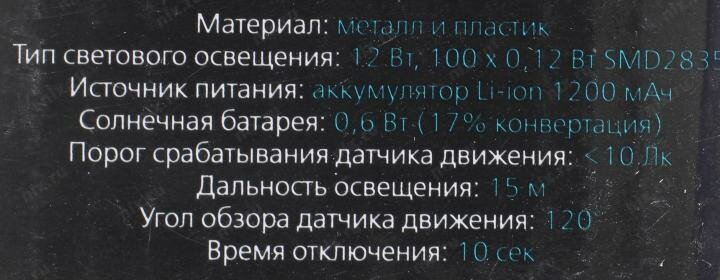 Настенный светильник 12Вт 100LED, на солнечных батареях, с датчиком движения, черный