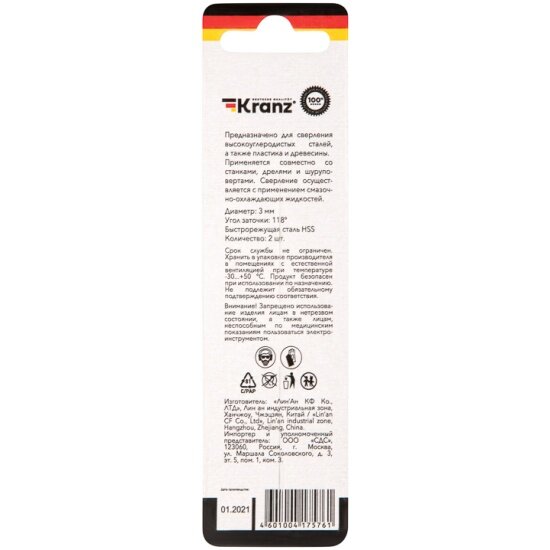 Сверло KRANZ по металлу 3,0 мм повышенной прочности с углом заточки 118 градусов HSS, 2 шт. в упаковке, DIN 338 интересное: