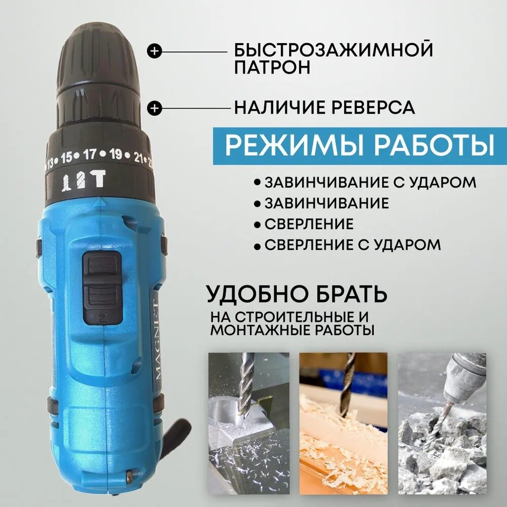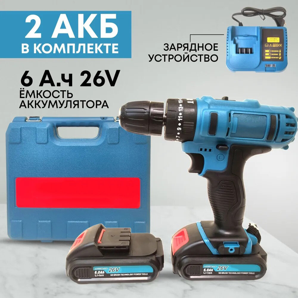Аккумуляторный дрель-шуруповерт, От аккумулятора, 26 В, 2 АКБ зарядки / набор инструментов(34)+ кейс для хранения + перчатки в комплекте интересное: