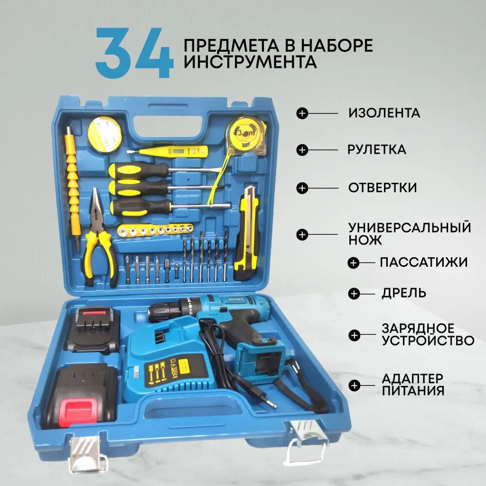 Купить Аккумуляторный дрель-шуруповерт, От аккумулятора, 26 В, 2 АКБ зарядки / набор инструментов(34)+ кейс для хранения + перчатки в комплекте