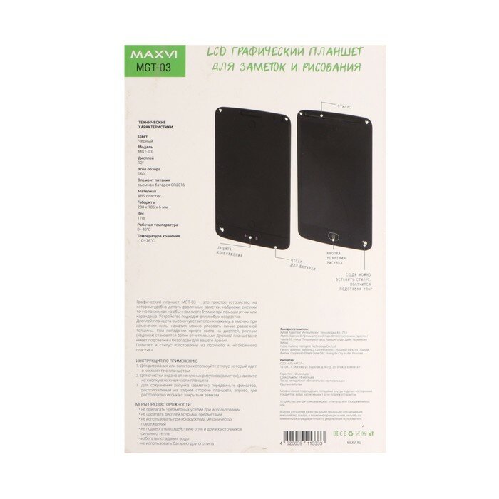 Maxvi Графический планшет для рисования и заметок LCD Maxvi MGT-03, 12”, угол 160°, CR2016, черный интересное: