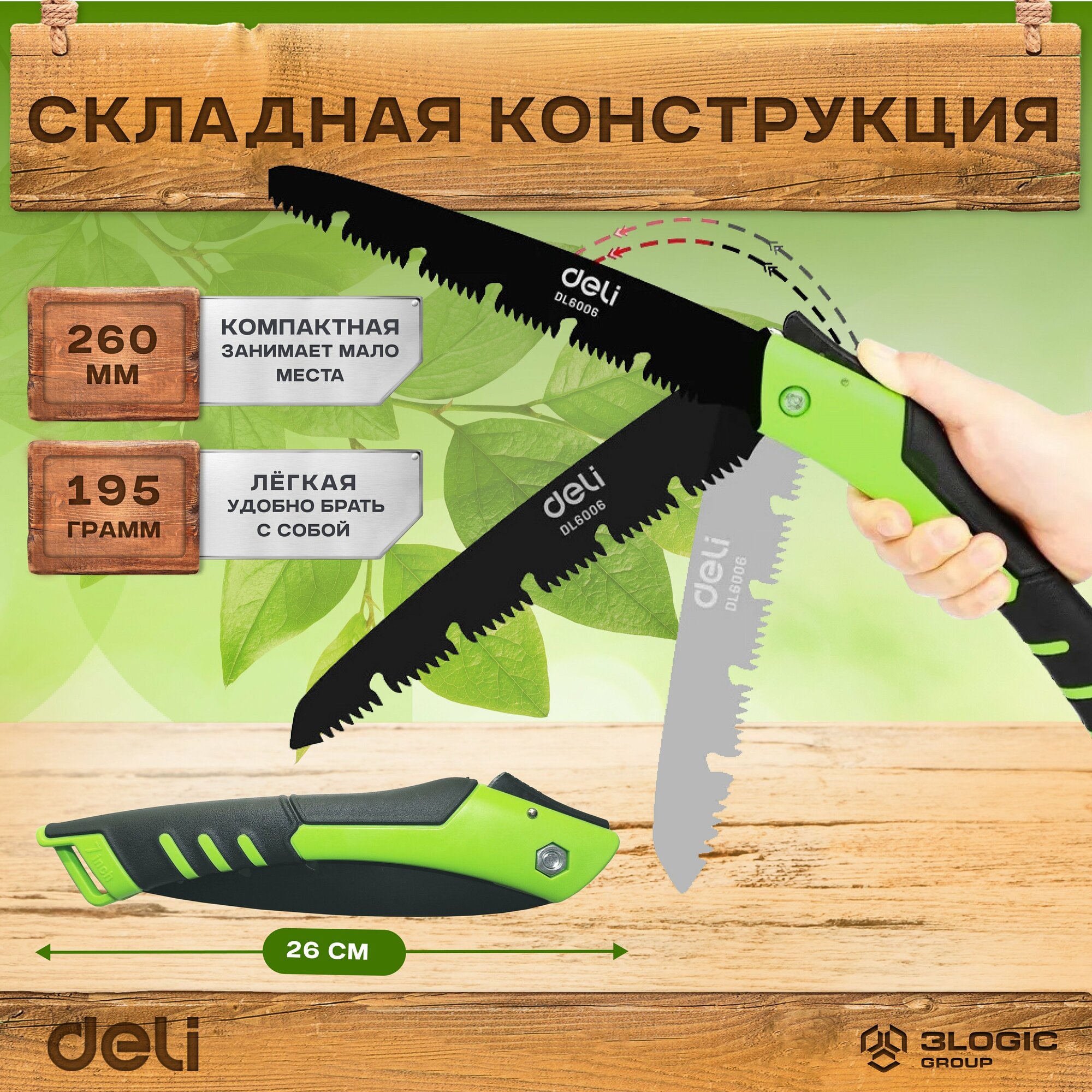 Садовая пила складная 180мм Deli DL6006 (сталь 65Mn, шаг зубьев 7 TPI, обрезиненая ручка, шлифовка зубов с 3-х сторон, двухрядное распределение кромок) 114773