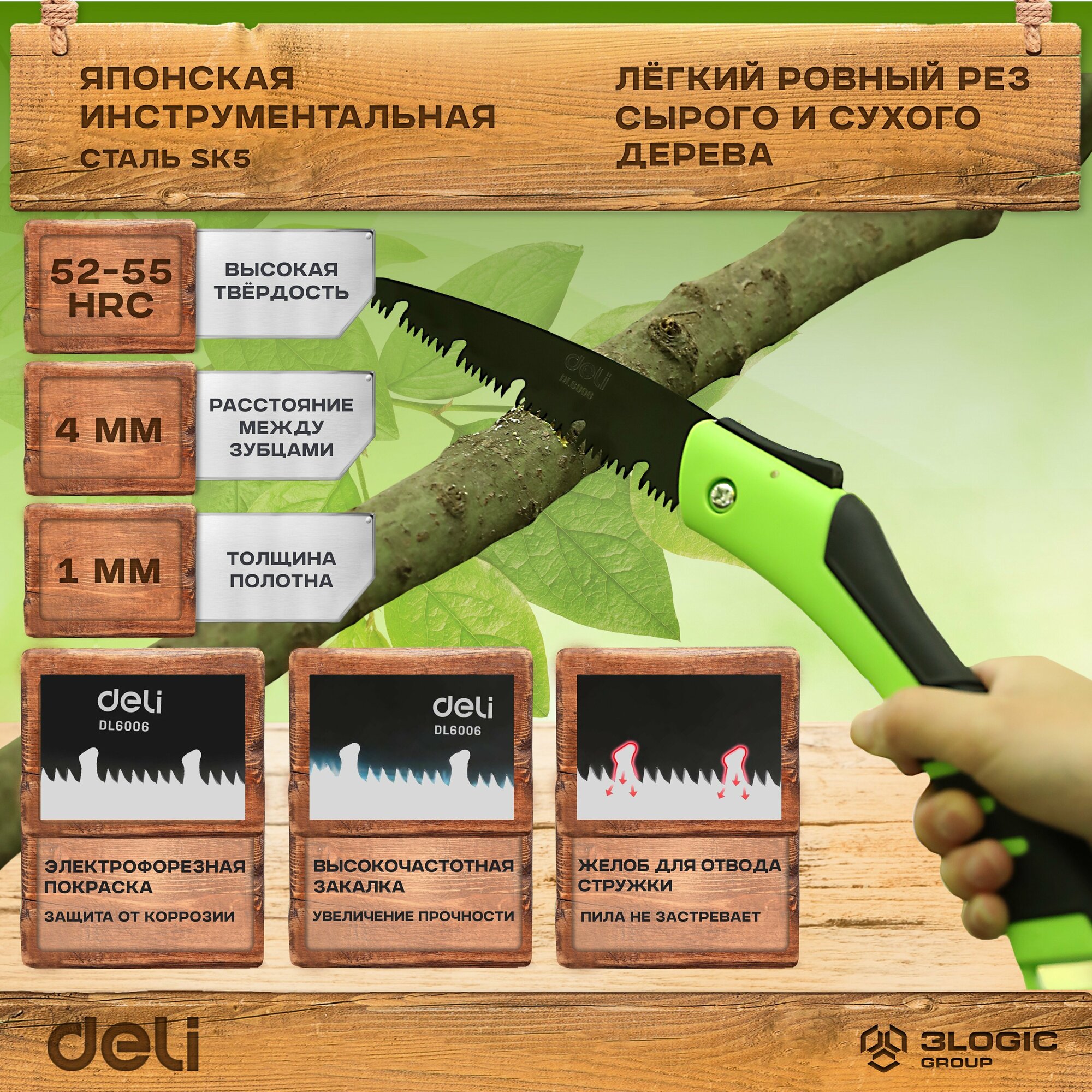 Садовая пила складная Deli DL6006 170мм (сталь 65Mn, 7 TPI, обрезиненная ручка, шлифовка зубов с 3-х сторон, двухрядное распределение кромок)