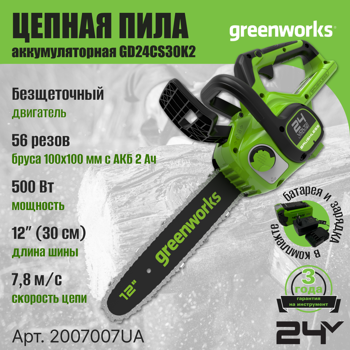Цепная пила аккумуляторная GreenWorks Арт. 2007007UA, 24V, 30см, бесщеточная, c 1хАКБ 2 Ач и ЗУ интересное: