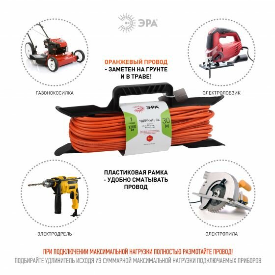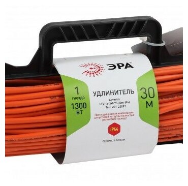 Удлинитель силовой Эра UFx-1e-3x0.75-30m-IP44, розеток 1шт, 3x0.75 кв.мм, 6A, 30м, ПВС, рамка пластиковая, оранжевый [б0046827]