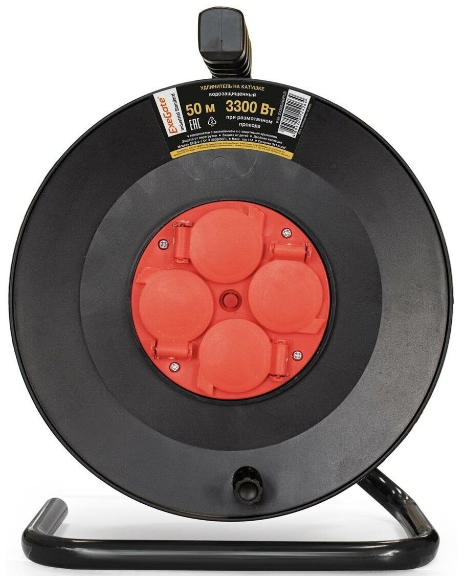 Удлинитель на катушке ExeGate EX286340RUS industrial ECS-2-1.5Y (4 евророзетки с заземлением и с защитными крышками, IP44, 50м, защита от детей, защита от перегрузки, 3х1,5мм2, 15А/3.3кВт)