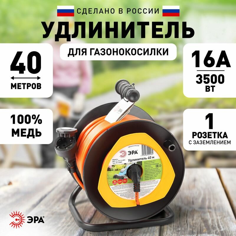 Силовой удлинитель ЭРА RPx-1e-3x1.5-40m, на пластиковой катушке, c заземлением, 40м, 1 гнездо, ПВС 3х1.5 Б0046839