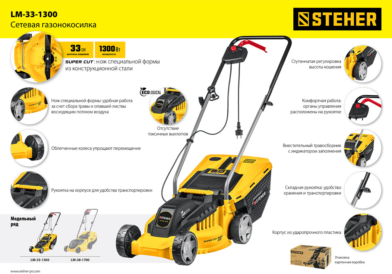 Газонокосилка STEHER LM-33-1300, 1300 Вт, 35 л интересное: