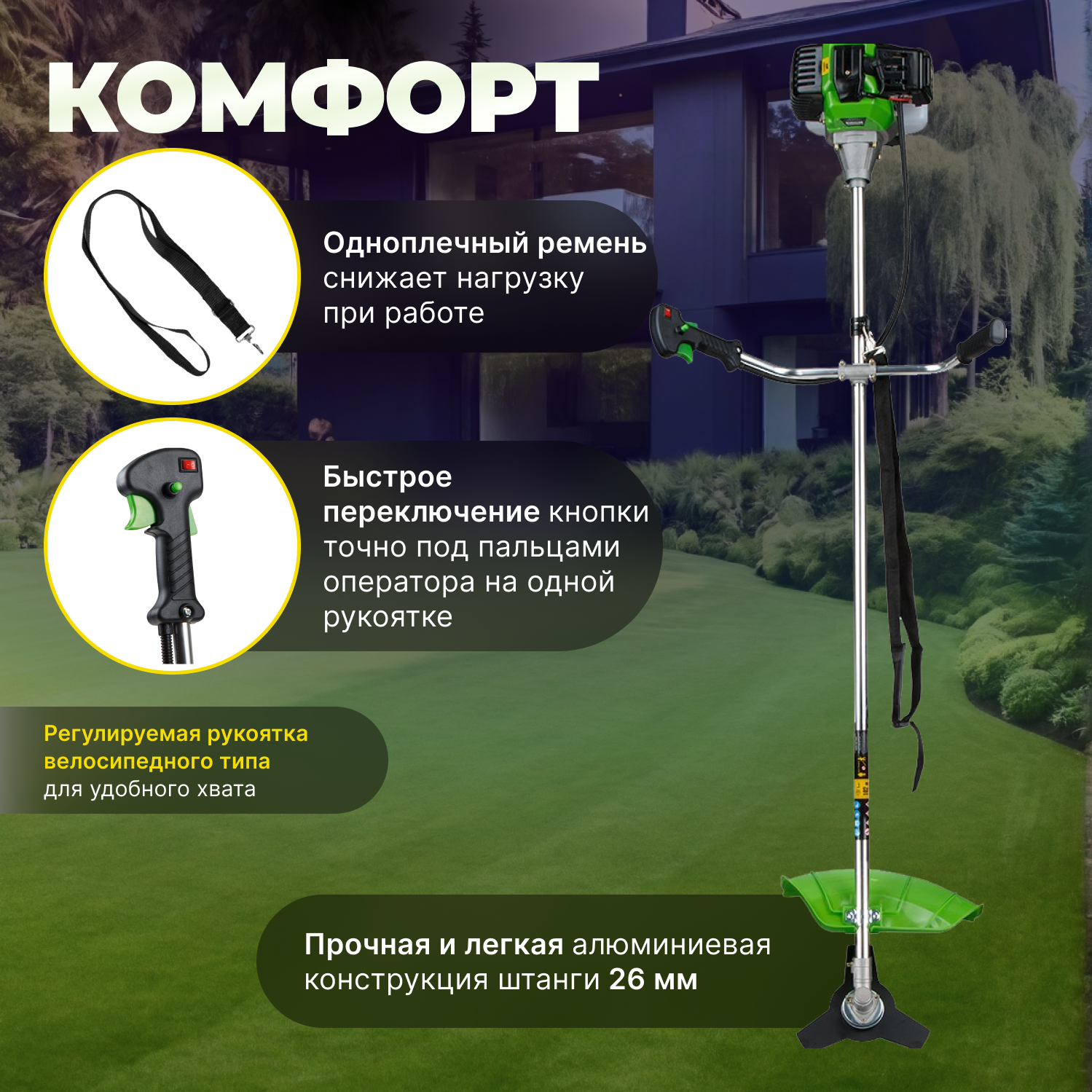 | Комплектация | леска (2.4 мм), нож, плечевой ремень |