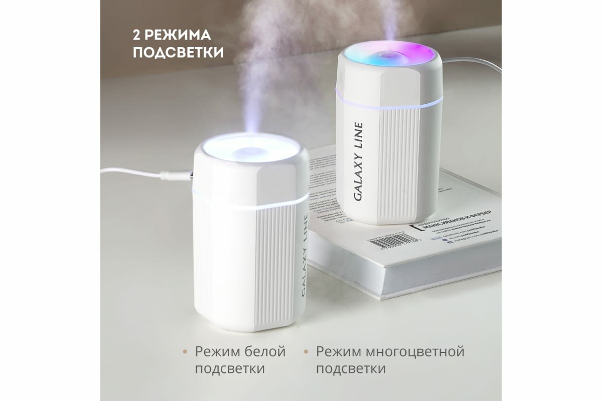Увлажнитель компактный,но производит большое количество пара.Можно по желанию установить два режима-сплошная струя или с трехсекундными перерывами.Так же есть два режима подсветки:белая и разноцветная.Можно использовать только как подсветку,только как увлажнитель или и то и другое одновременно.Я сегодня получила увлажнитель и испытала его.В отзывах писали,что что-то не работает,но мне повезло,все в порядке,я довольна.Советую к покупке,тем более я купила за 800 руб. в рассрочку на 6 месяцев с переплатой всего 1 руб.