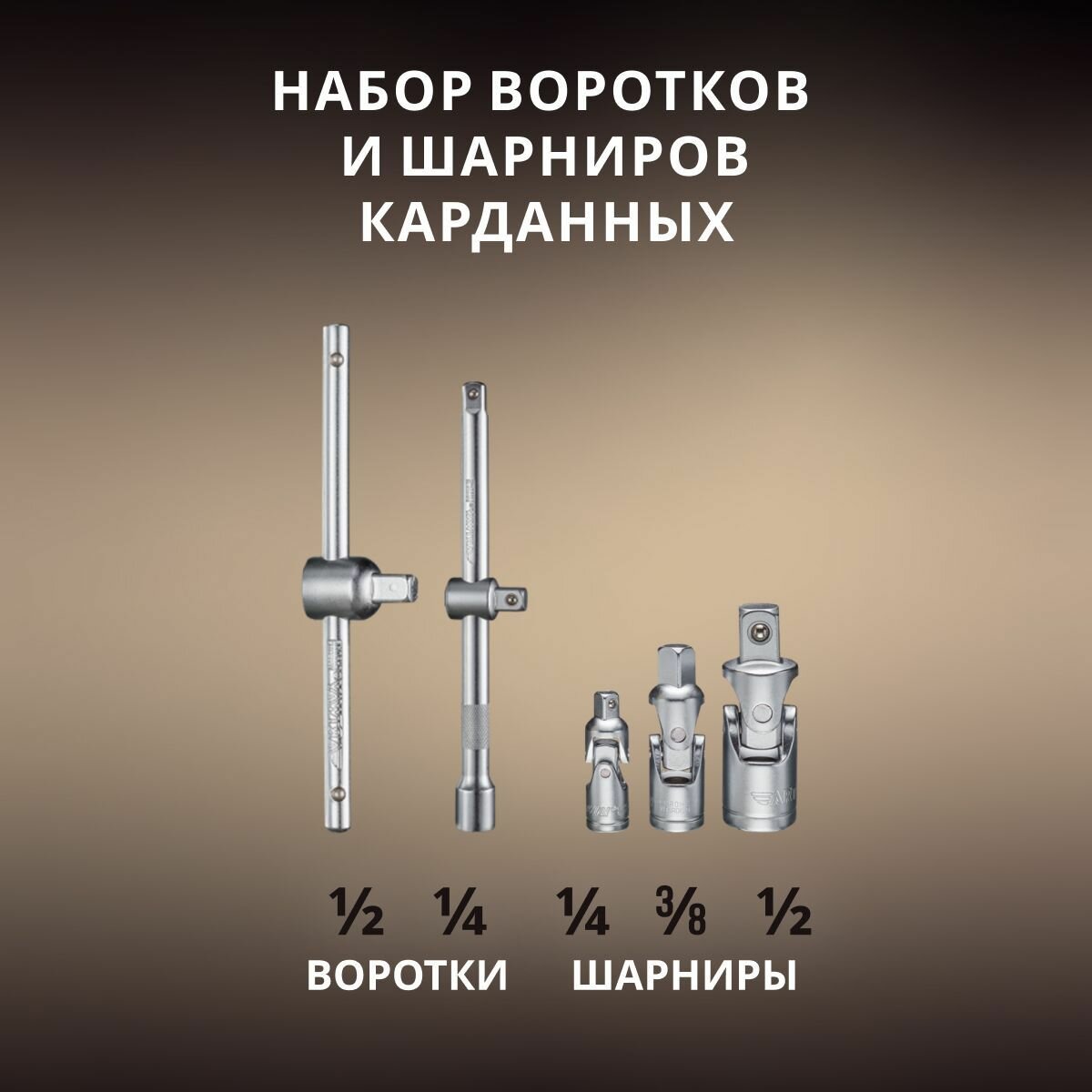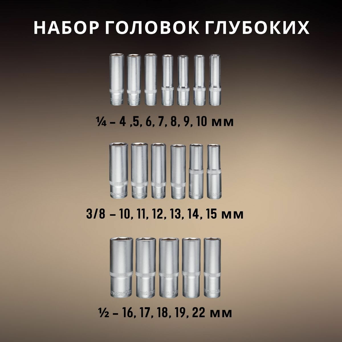 | Головки торцевые подробно | Головки торцевые 1/2" 6 граней:10,11,12,13,14,15,16,17,18,19,20,21,22,24,27,30,32 мм. Готовки торцевые TORX 1/2'': E20,E24 мм. Головки торцевые глубокие 1/2":16,17,18,19,22 мм. Головки торцевые 1/4" 6 граней: 4-4,5-5-5,5-6-7-8-9-10-11-12-13-14 мм. Готовки торцевые TORX 1/4'':E4,E5,E6,E7,E8 мм. Головки глубокие 1/4" 6 граней:4,5,6,7,8,9,10 мм. Головки торцевые 3/8" 6 граней:10,11,12,13,14,15,16,17,18,19 мм. Готовки торцевые TORX 3/8'':E10,E11,E12,E14,E16,E18 мм. Головки глубокие 3/8" 6 граней:10,11,12,13,14,15 мм. Головка свечная 3/8":18 мм. |