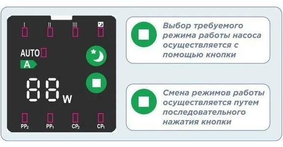 | Функции | Работа в автоматическом режиме / Работа в закрытых водяных циркуляционных системах / Работа в закрытых циркуляционных системах с содержанием гликоля не более 40% / Работа в ночном режиме с минимальными рабочими параметрами / Работа в системах с переменным расходом / Работа в системах с поддержанием постоянного перепада давления / Работа в трех режимах согласно стандартным характеристикам насоса / в выделенном рабочем диапазоне |