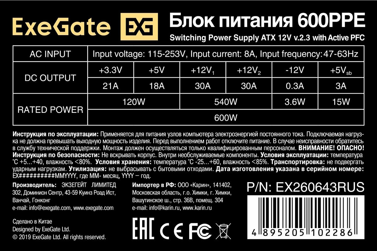 Блок питания ExeGate 600W 600PPE EX260643RUS-S
