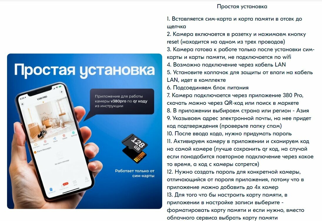 | Минусы: | На коробке нет подробной информации и даже изображения самой камеры ????? только поезд ? 4G не работает. Пишут, что симка не поддерживает эту функцию. |
