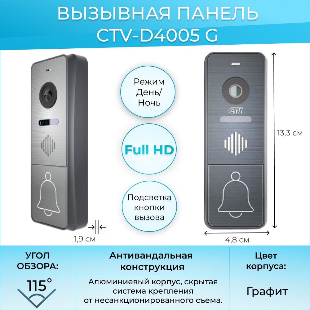 CTV-D4005 (Графит) Вызывная панель видеодомофона, Видеокамера 2Mp FULL HD, обзор 115 градусов, ИК-подсветка, БУЗ в комплекте, Антивандальный корпус, -30...+50С