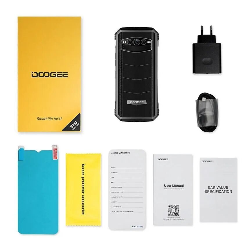 Doogee Doogee S100 Cyber Yellow, 16,71 см (6.58") 2408 x 1080 пикселей, 2.2GHz, 8 Core, 12 ГБ, 256GB, up to 2TB flash, 108 МП+ 20 МП + 16 МП/32Mpix, 2 Sim, 2G, 3G, LTE, 5.2, Wi-Fi, NFC, GPS, Type-C, 10800 мА·ч, Android 12, 376 г, 178,4 ммx83,1 ммx17,9 мм
