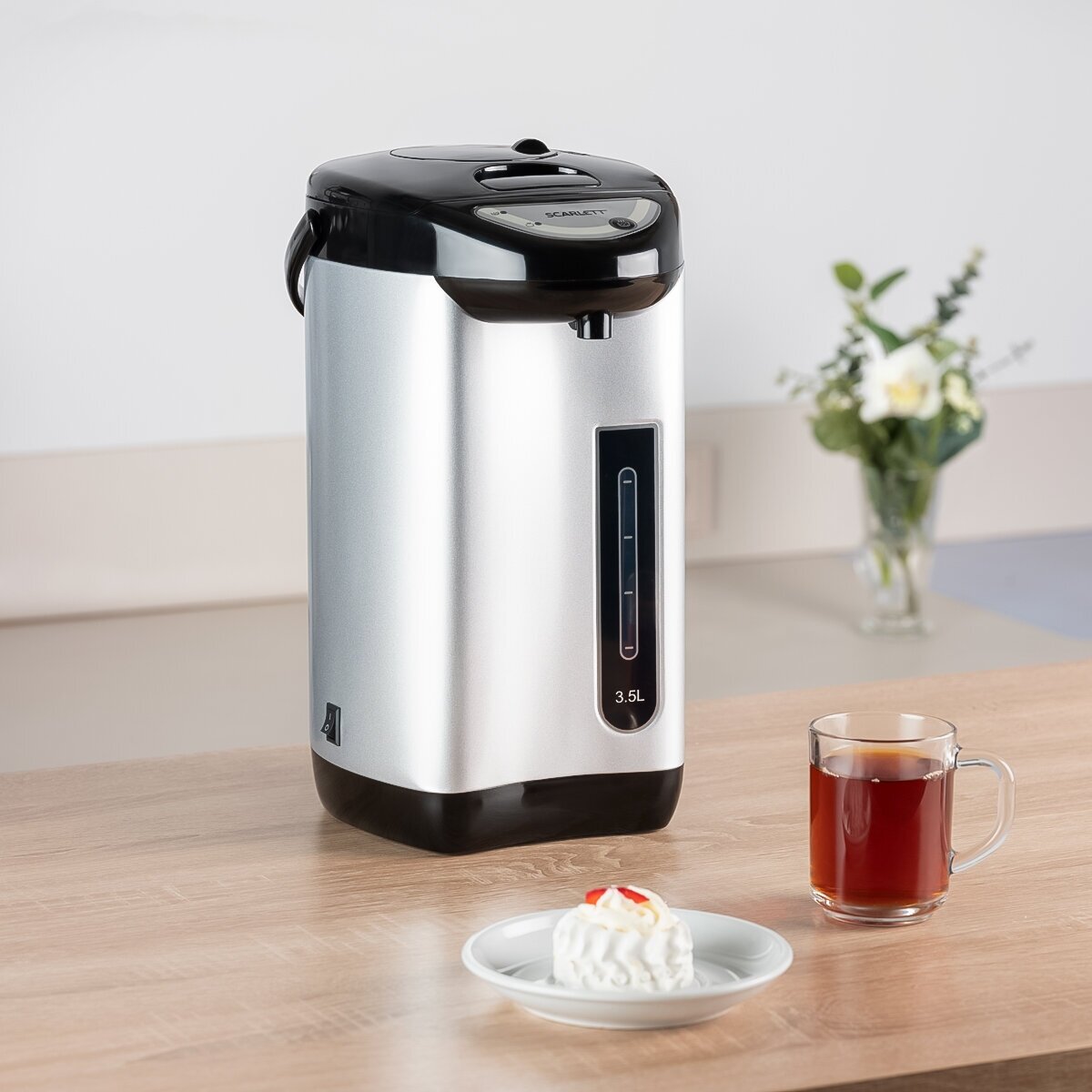 Термопот на 3,5 л, ручной насос, SCARLETT SC-ET10D01, 750 Вт, 1 температурный режим, сталь, черный/серебристый