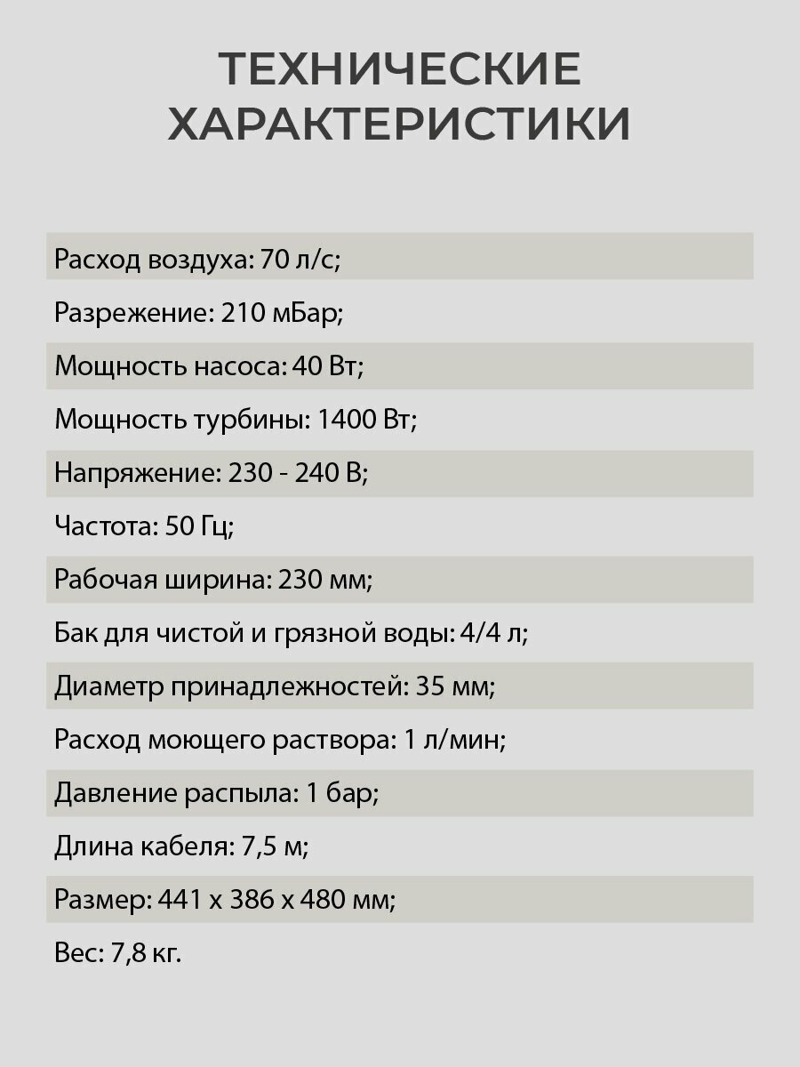 | Насадки в комплекте | пол/ковер; щелевая; для мебели; с экстракцией моющего средства |