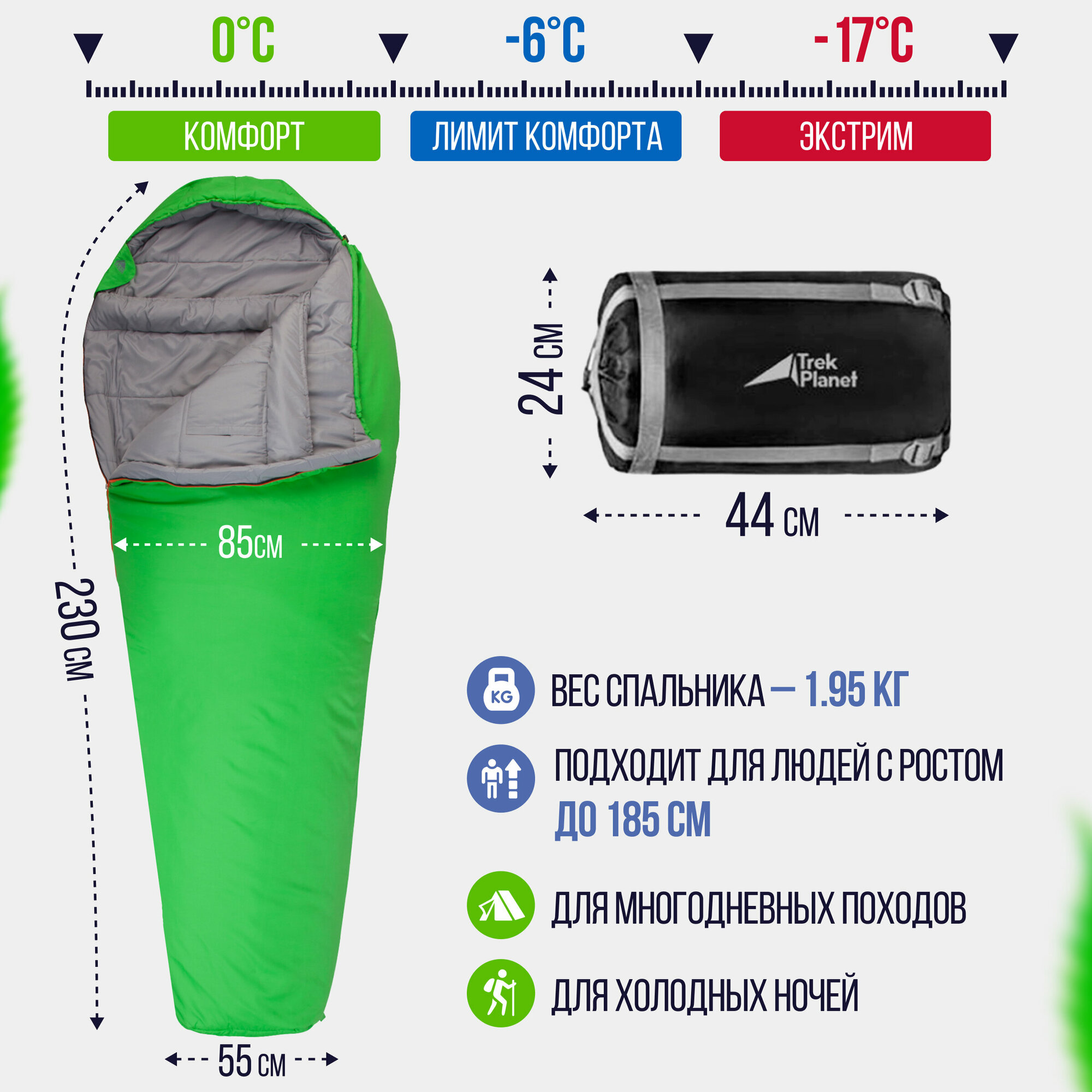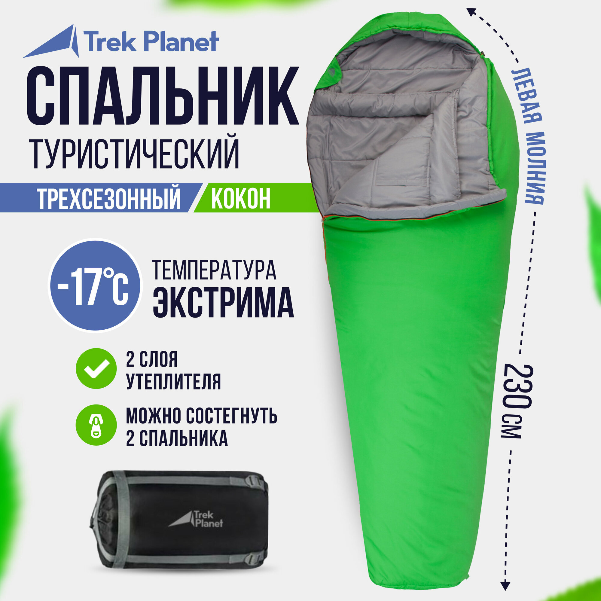 Спальный мешок TREK PLANET Redmoon, трехсезонный, левая молния, цвет: зеленый