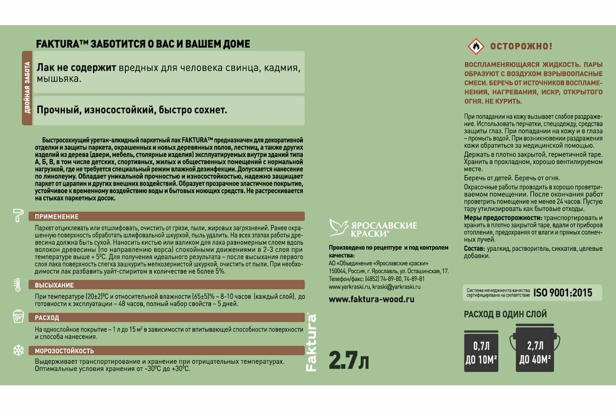 Лак Паркетный Faktura 2.7л Глянцевый Алкидно-Уретановый, Износостойкий для Внутренних Работ / Фактура.