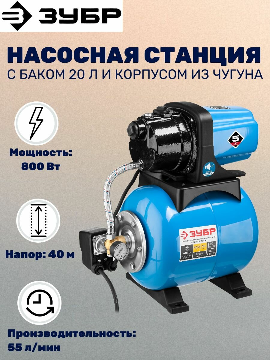 ЗУБР 800 Вт, бак 20 л, автоматическая насосная станция, чугунный корпус (НАС-М3-800-Ч)