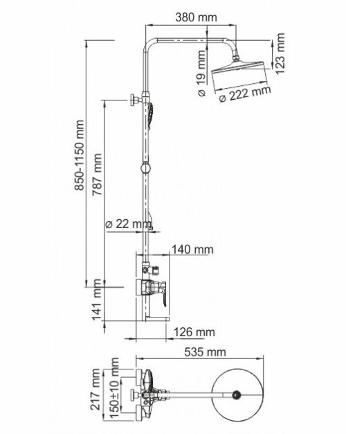 | Дополнительная информация | высота стойки для душа: 1150 мм; диаметр верхнего душа: 222 мм |