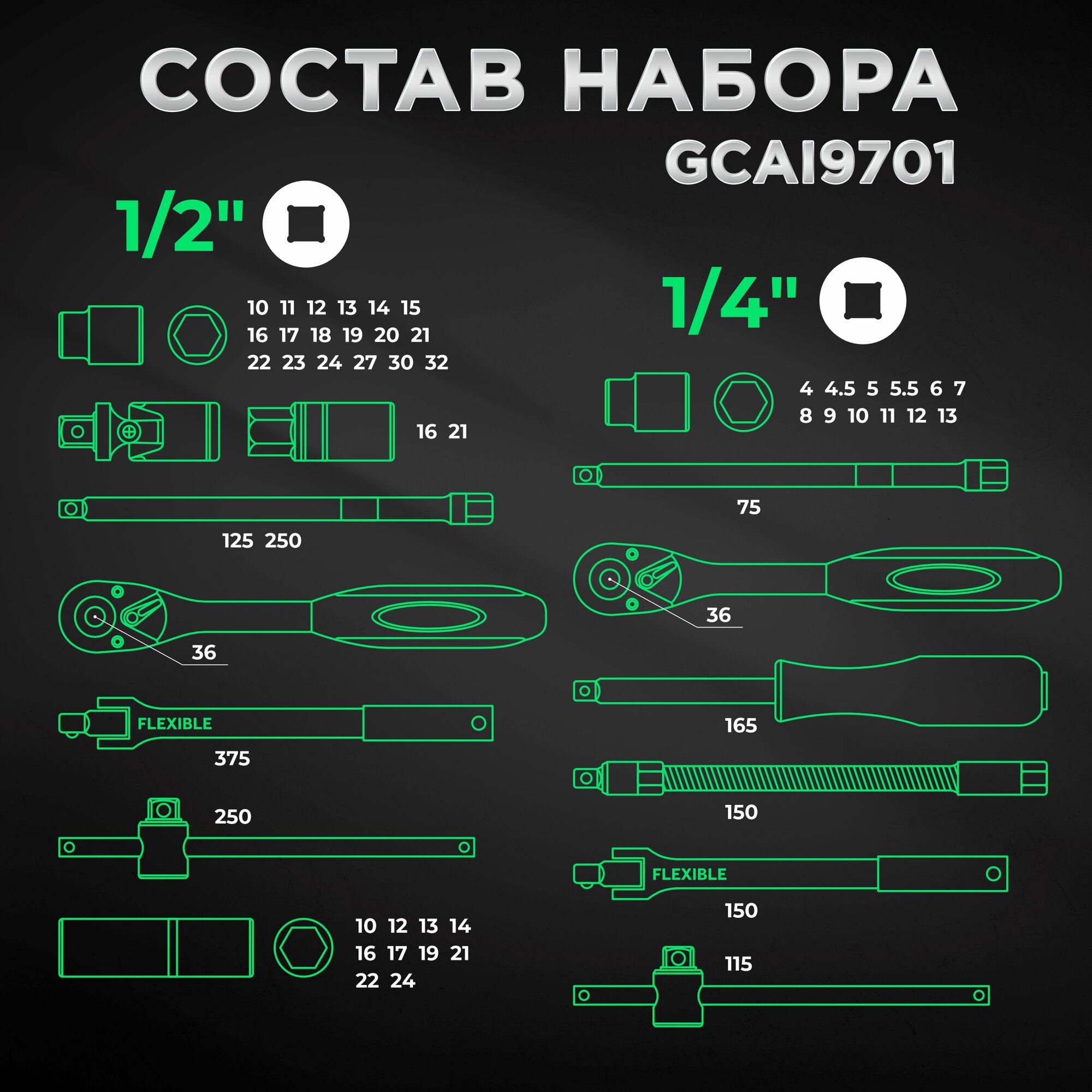 | Головки торцевые подробно | 1/4": 4, 4.5, 5, 5.5, 6, 7, 8, 9, 10, 11, 12, 13 мм; длинные 1/4": 4, 4.5, 5, 5.5, 6, 7, 8, 9, 10, 11, 12, 13 мм; 1/2": 10, 11, 12,… 13, 14, 15, 16, 17, 18, 19, 20, 21, 22, 23, 24, 27, 30, 32 мм; длинные 1/2": 10, 12, 13, 14, 16, 17, 19, 21, 22, 24 мм; удлинитель 1/4": 100 мм; удлинитель 1/2": 125, 250 мм; вороток т-образный 1/4": 115 мм; вороток т-образный 1/2": 250 мм; карданный шарнир 1/4", 1/2"; трещотка 1/2", 1/4": 36 зубов ещёскрыть |