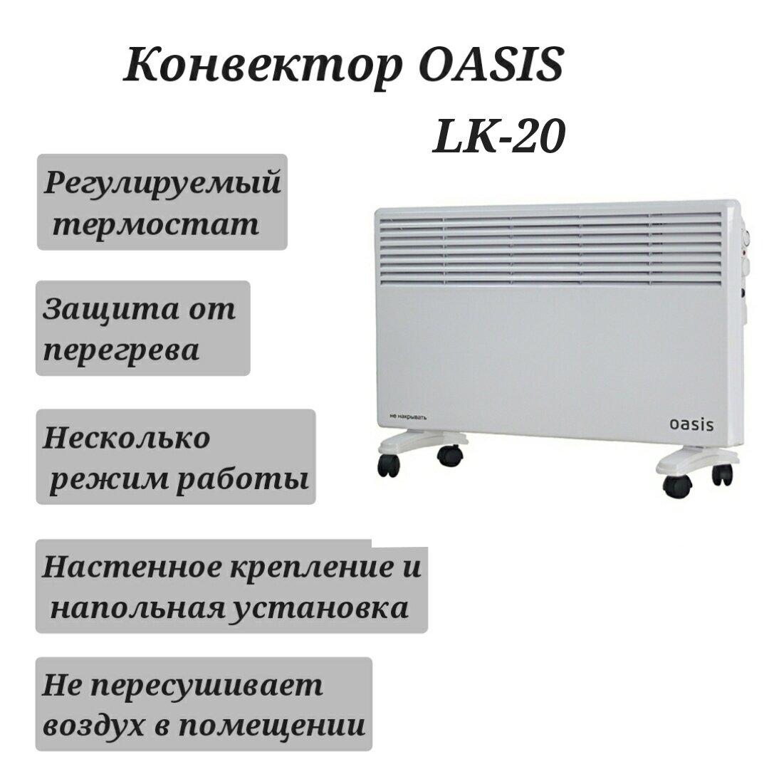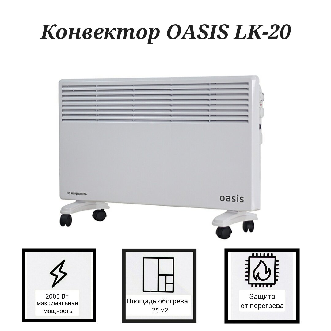 Конвектор электрический Oasis LK-20 2000Вт, настенная/напольная (колесики) установка