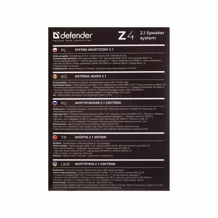 Ниже Вы можете прочитать отзывы на Компьютерные колонки 2.1 Defender Z4, 2х3 Вт + 5 Вт, USB, черные, ознакомится с подробными характеристиками, посмотреть интересные обзоры и фотографии на Компьютерные колонки 2.1 Defender Z4, 2х3 Вт + 5 Вт, USB, черные.