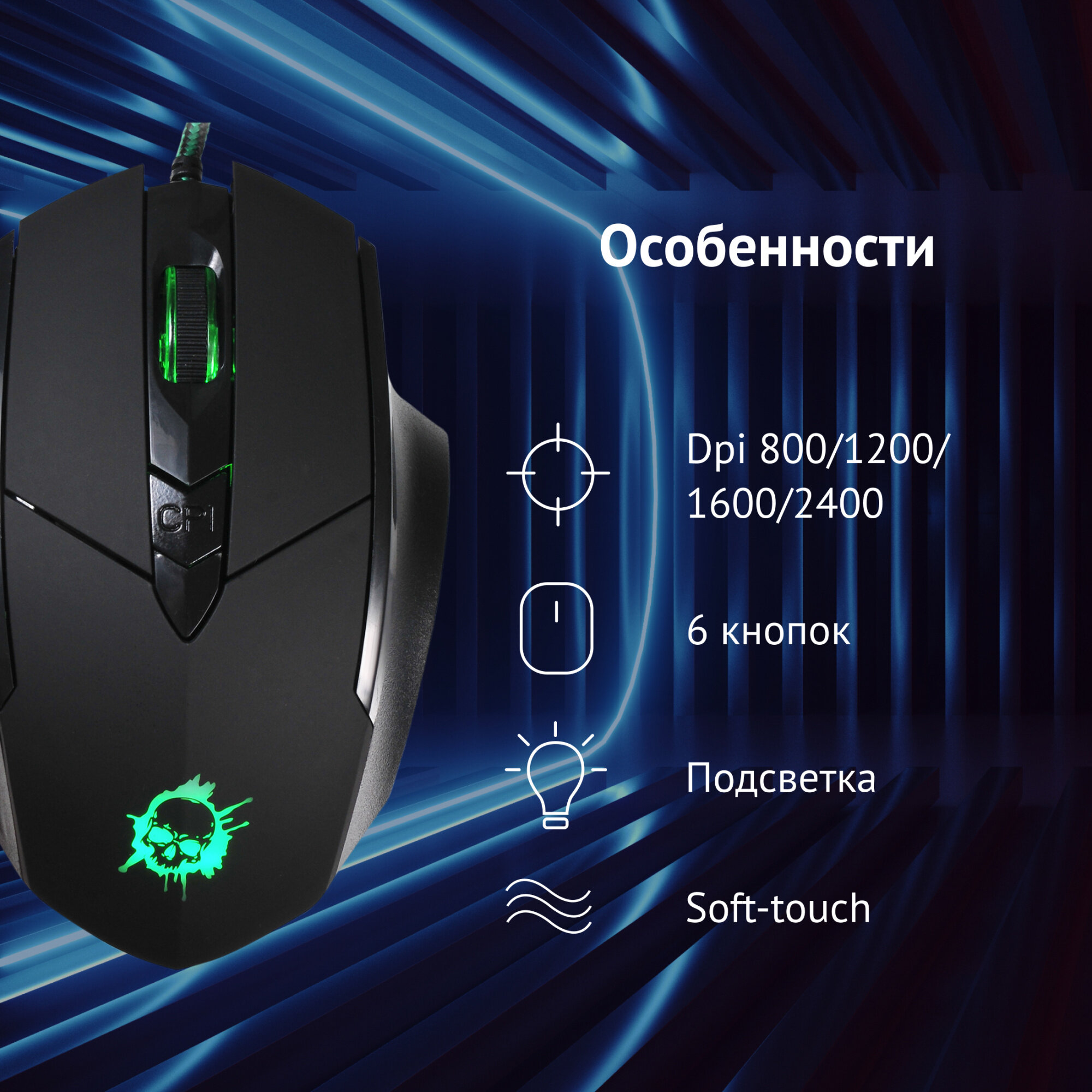 | Плюсы: | Внешний вид, 5 кнопок, 4 режима dpi. Хорошо лежит в руке. Soft-touch покрытие на верхней части корпуса и ЛКМ, СКМ, провод в оплетке. |