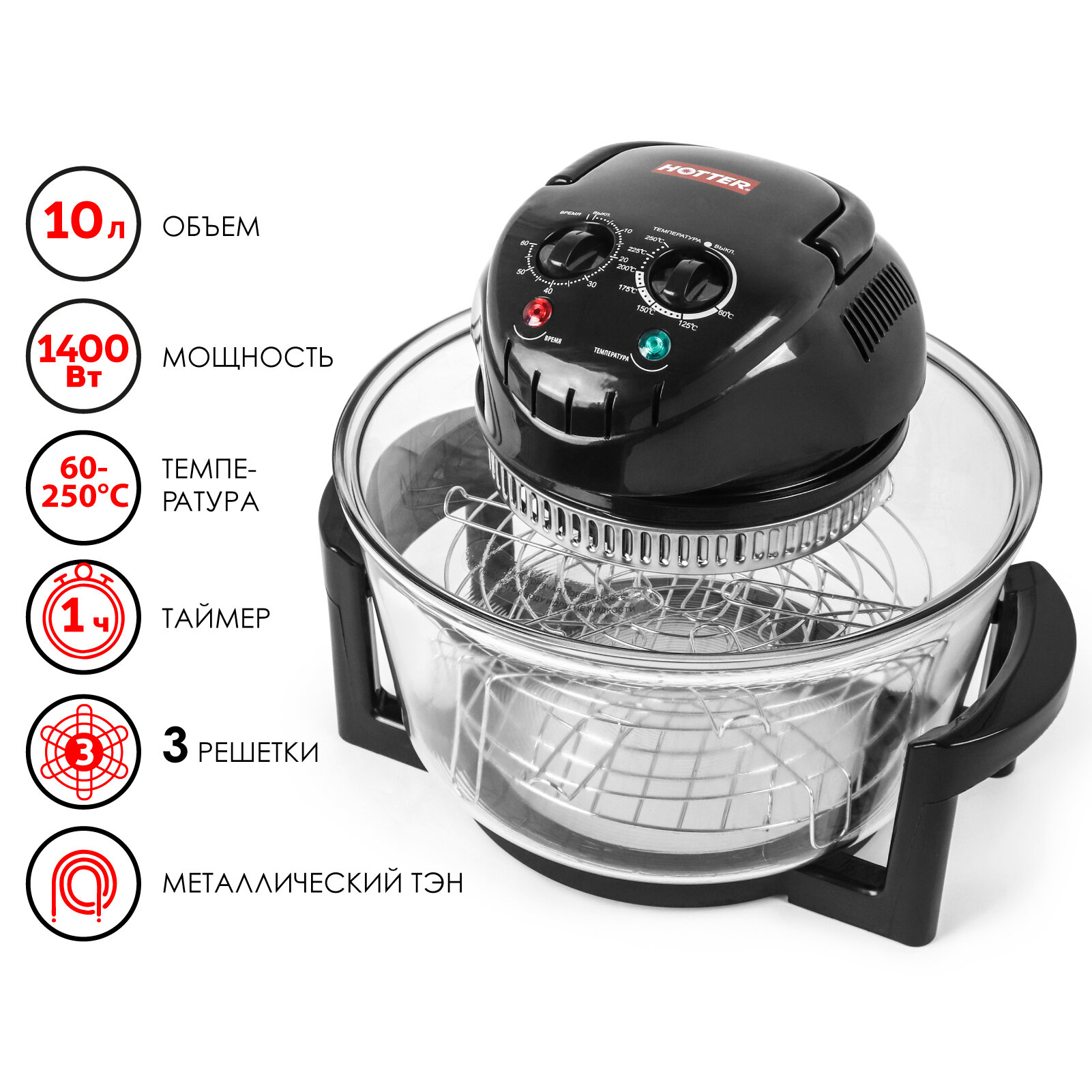 СохранитьАэрогриль HOTTER Economy HX-1036 черный с механическим управлением (регулировка температуры 60-250 градусов, таймер на 60 минут) интересное: