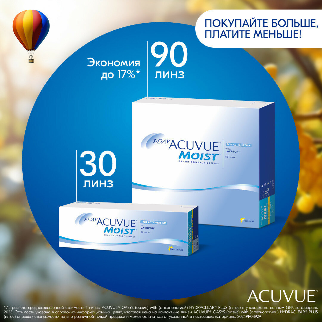 Контактные линзы Acuvue 1-Day Moist for Astigmatism, 90 шт., R 8,5, D -4,25, CYL: -0,75, AХ: 180