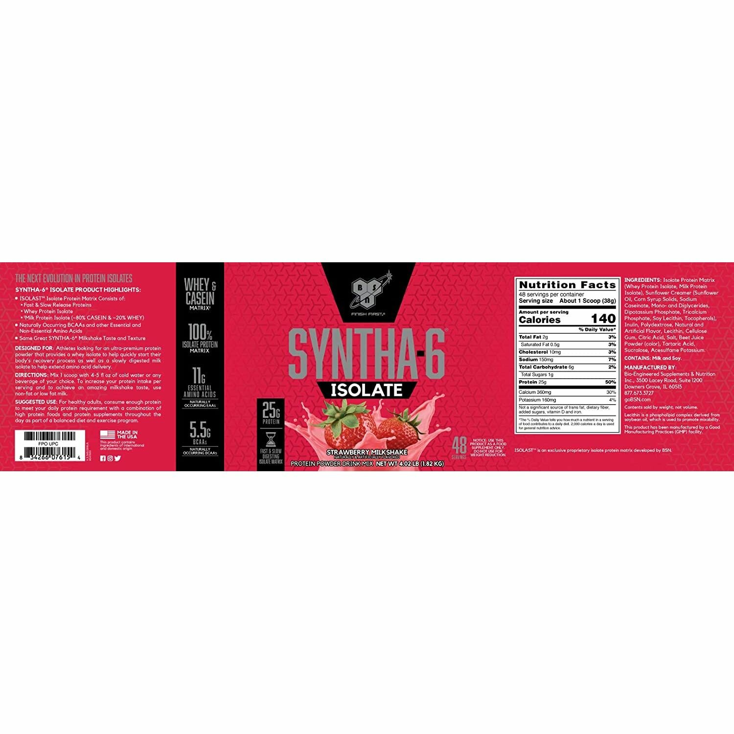 Изолят протеина BSN SYNTHA-6 ISOLATE 1820 г / 4.02 LB, Молочный коктейль с клубникой