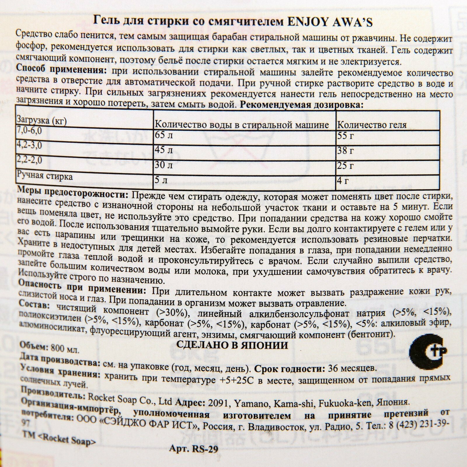 Rocket Soap Гель "Enjoy Awa's" для стирки со смягчителем (чарующий цветочный аромат) 0,8 кг