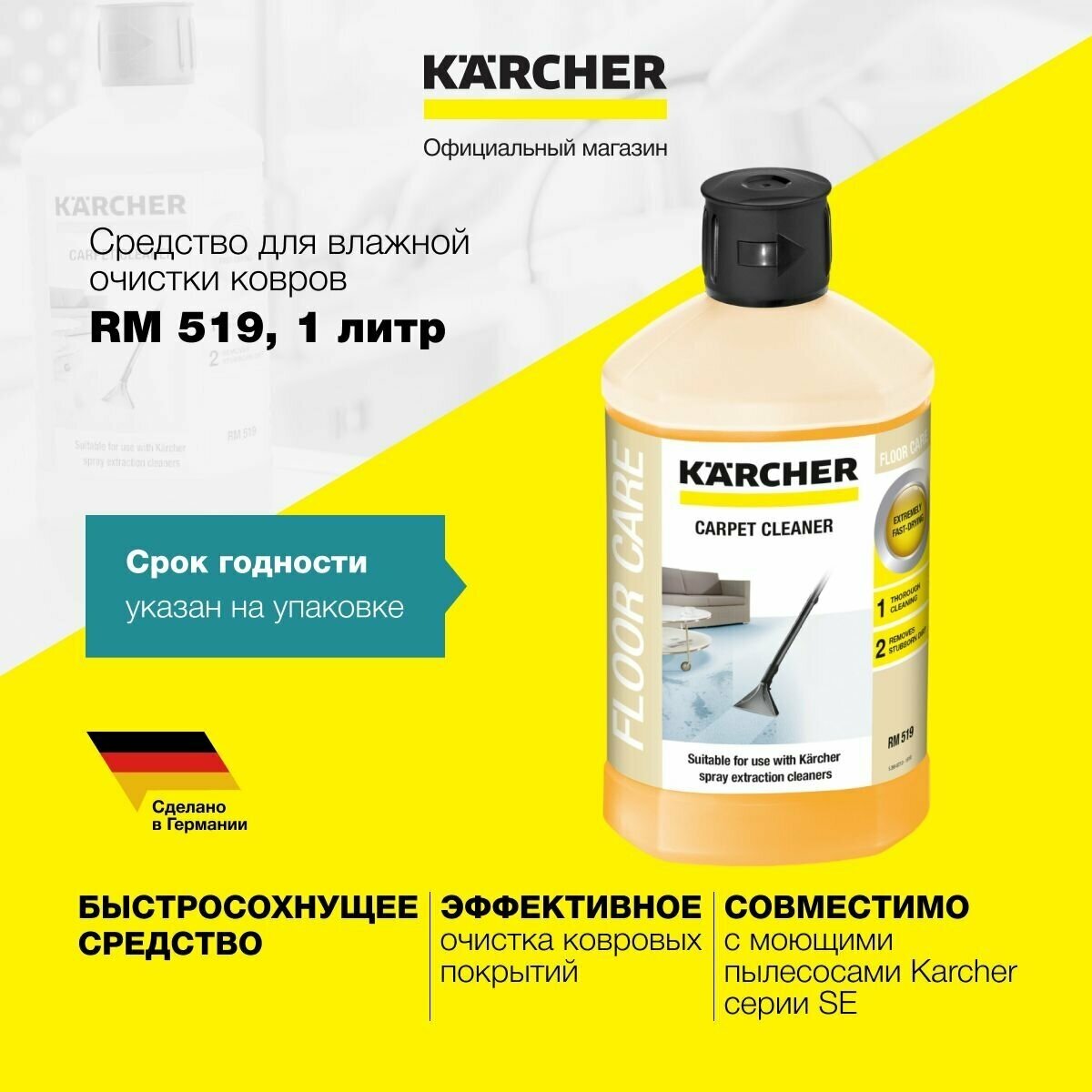 Ниже Вы можете прочитать отзывы на Средство для чистки ковров 3 в 1 KARCHER 6.295-771.0 RM 519, 1 л, ознакомится с подробными характеристиками, посмотреть интересные обзоры и фотографии на Средство для чистки ковров 3 в 1 KARCHER 6.295-771.0 RM 519, 1 л.