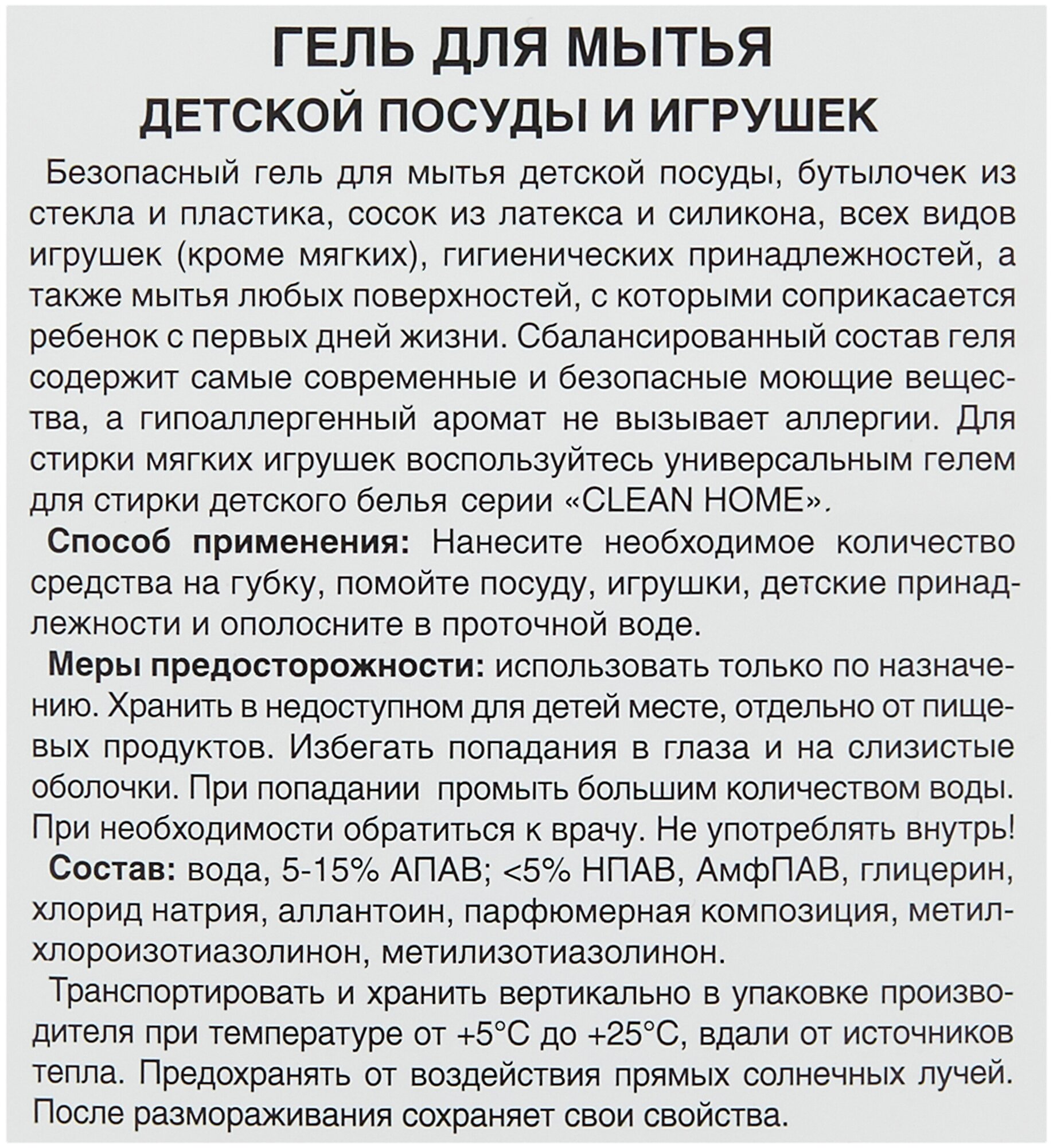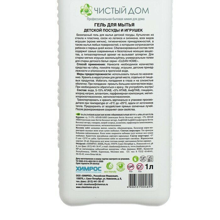 Гель для мытья детской посуды и игрушек CLEAN HOME 1л