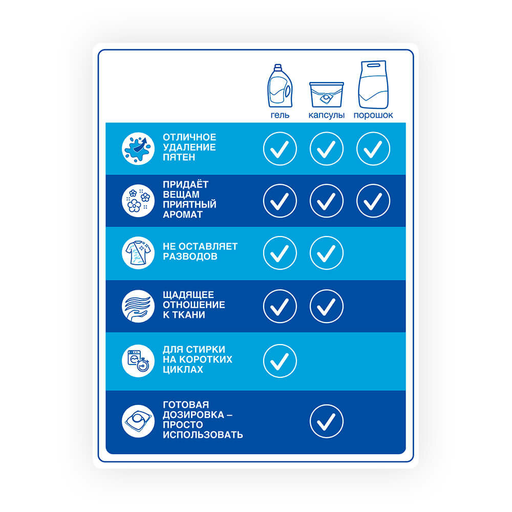 | Плюсы: | Хорошо отстирывает, экономичный расход, приятный запах после стирки |
