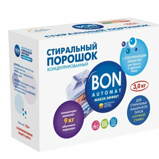 СохранитьСтиральный порошок BON Automat Макси-Эффект с отбеливающим эффектом, концентрированный, 3кг . интересное: