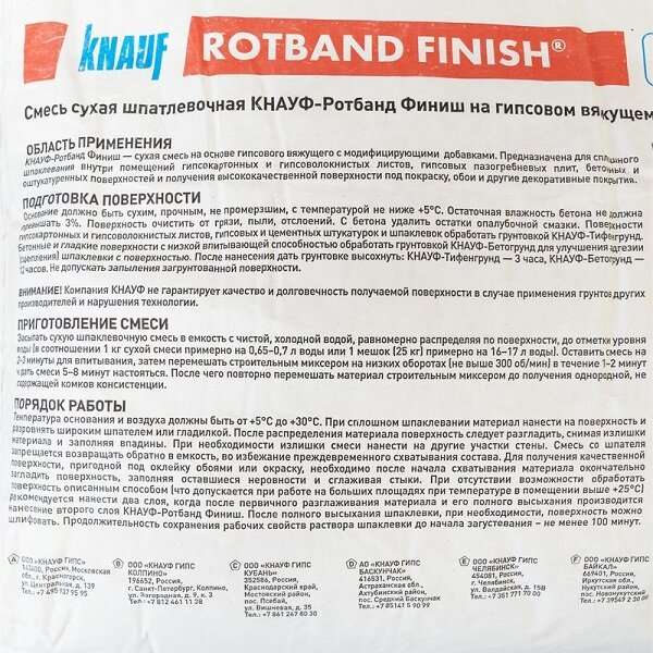 КНАУФ Ротбанд Финиш Шпаклёвка гипсовая 25кг / KNAUF ROTBAND FINISH Шпаклёвка гипсовая финишная 25кг