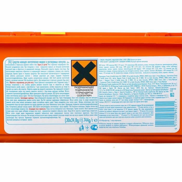 Мне очень нравится, что пачки прочно стоят друг на друге, а за счет маленькой и прямоугольной формы их легко уместить порой даже в самых неожиданных местах. И даже упаковки с большим количеством капсул будут также хорошо подходить "как пазл" к меньшим при хранении. Упаковка изготовлена из перерабатываемого пластика, что позволяет снизить количество отходов и нагрузку на природу планеты. Я отсортировываю пластик из общего мусора и выкидываю его в специальный контейнер-сетку возле соседнего дома. Капсулы Tide All in 1 PODs оснащены желтым стикером, гарантирующим, что в упаковке нужное количество капсул и никто не украл даже одну. К тому же этот стикер защищает закрытые пачки от открывания детьми. Сначала положить капсулу в барабан, а потом уже загрузить белье. А также что капсула эффективна уже при 20 градусах и может использоваться при температуре до 95 градусов. 1 капсула рассчитана на 1 стирку 4-5 кг белья, однако добавьте 2 капсулы если белье сильно загрязнено или у вас жесткая вода. Сама капсула содержит в себе 3 разных компонента, которые не должны смешиваться между собой до попадания в барабан машинки. Компоненты внутри очень концентрированные, поэтому нельзя касаться их руками, не должно ничего попасть на кожу, в глаза и тем более внутрь. При контакте с водой оболочка капсулы растворяется и моющее средство начинает свою работу. Капсула полностью растворяется без остатка в процессе стирки, распределяется равномерно в воде и хорошо выполаскивается с ткани. Я стираю в холодной воде, и Tide All in 1 PODs отлично справляются со своей работой! Вот Вам пример самых грязных вещей из последней стирки, и как справились капсулы со своей работой. |