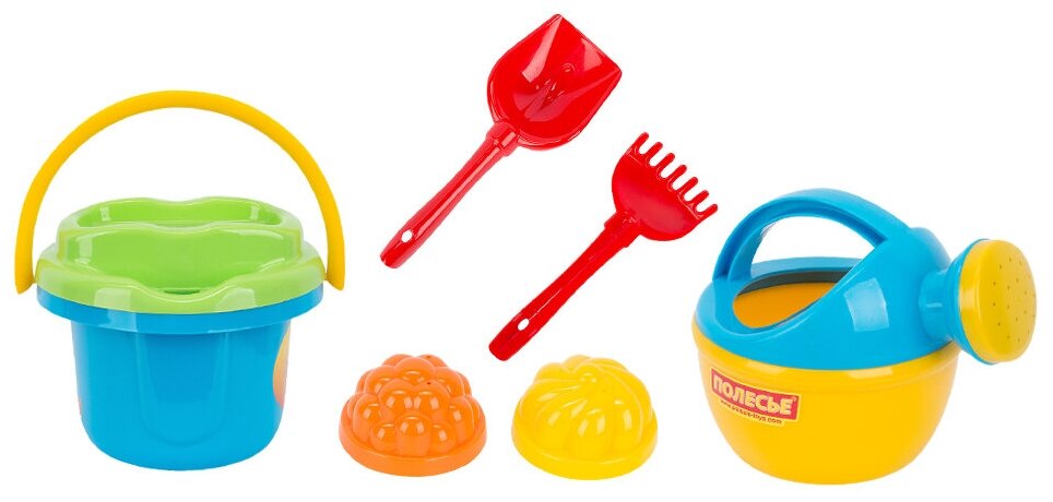 Набор №197: ведро большое, ситечко большое, лопатка №5, грабельки №5, 2 формочки, лейка малая №4 интересное: