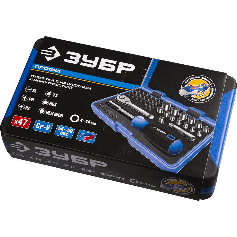 Набор ЗУБР "профи": Отвертка с двухкомп рукояткой, насадки и мини трещетка, 47 предм, пластиковый бокс 25283-H47