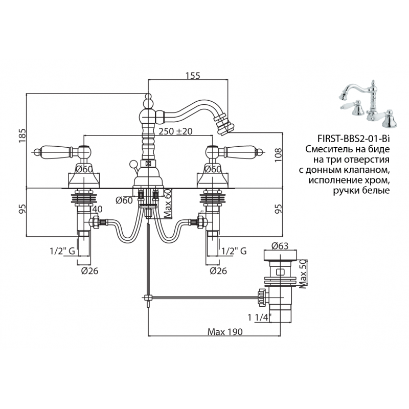 Смеситель Cezares First FIRST-BBS2-03/24-M для биде с донным клапаном