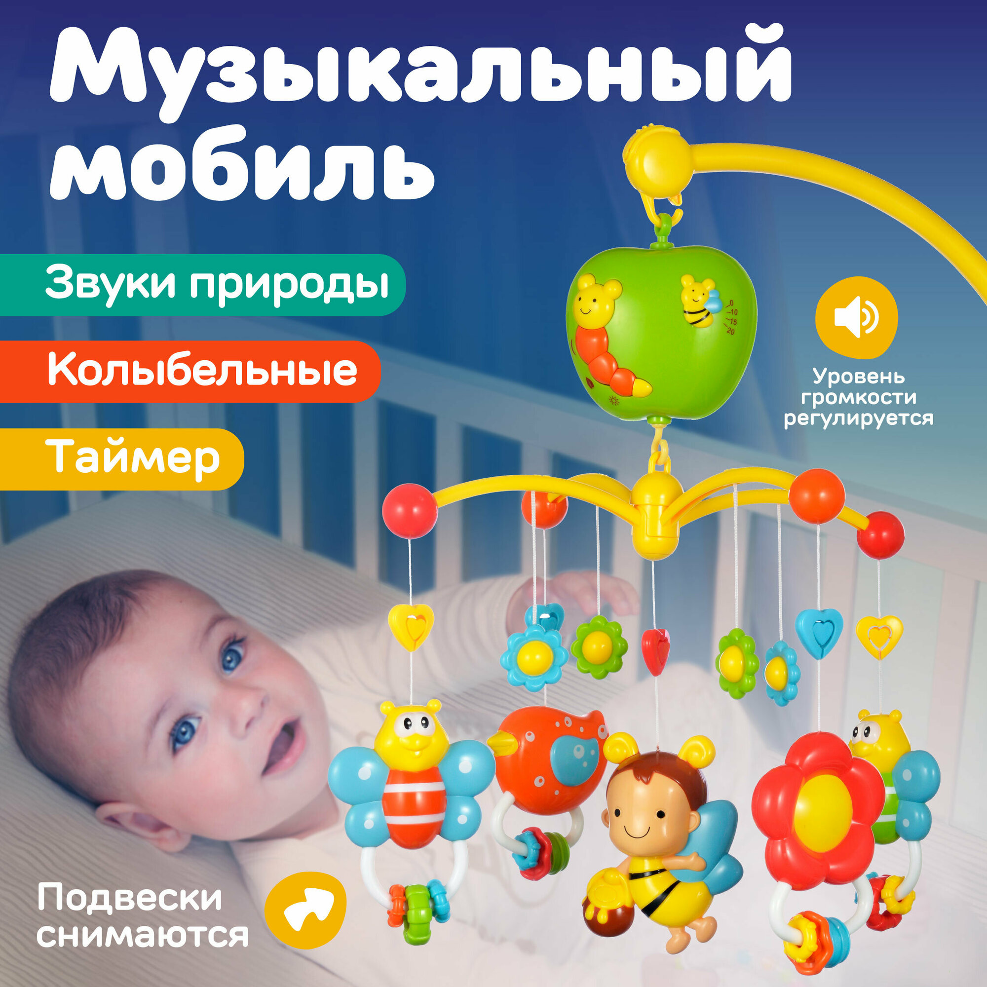 Мультифункциональный мобиль "Волшебная полянка": таймер выключения, 18 мелодий, съемные игрушки-погремушки