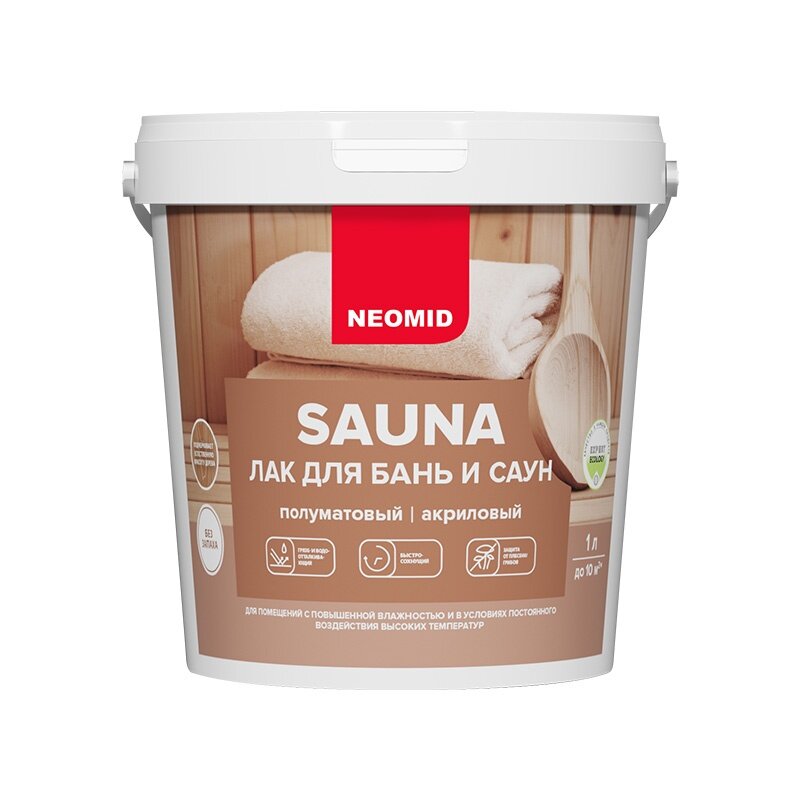 Акриловый лак для бань и саун NEOMID SAUNA полуматовый, без запаха (1 л) / Для защиты древесины во влажных условиях