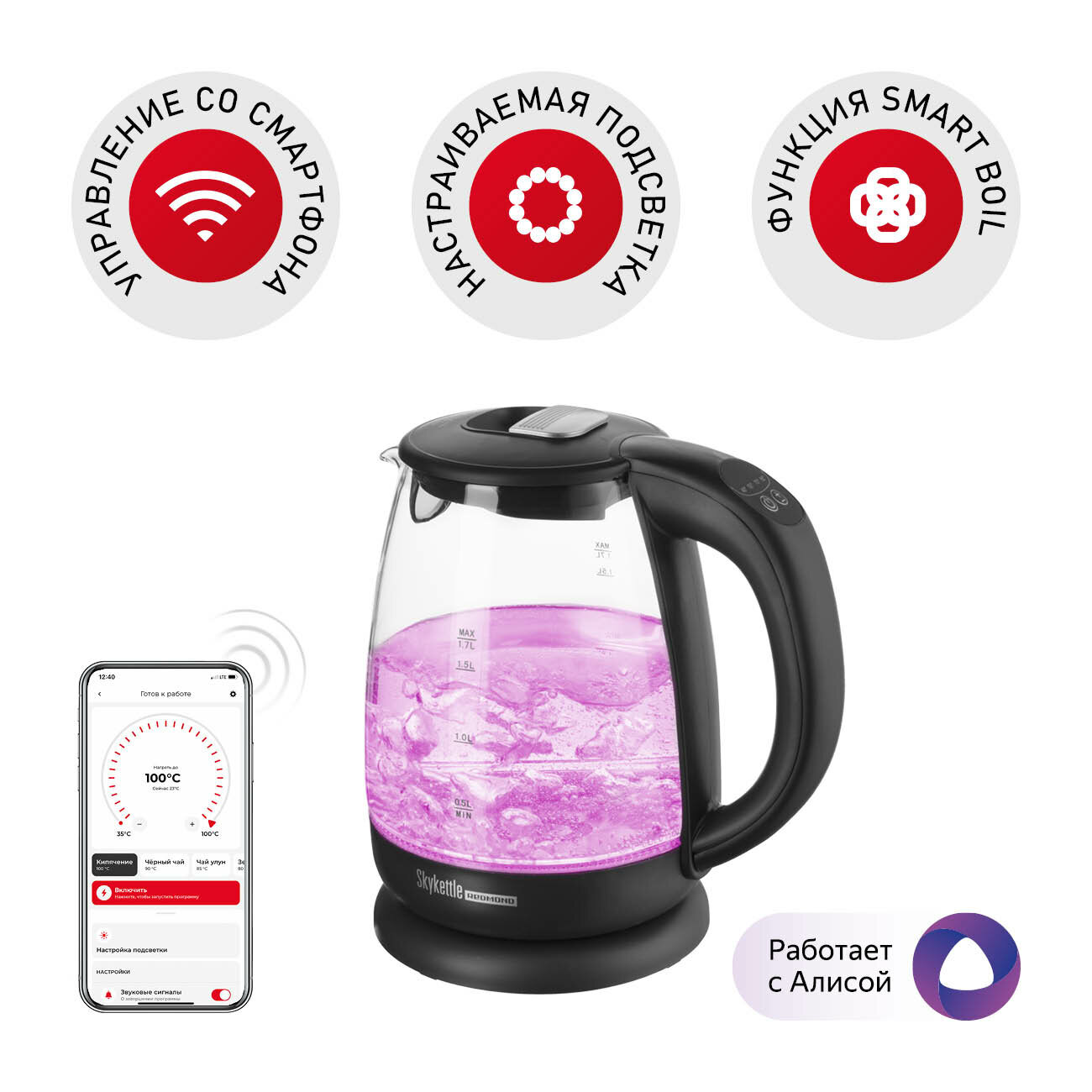 | Плюсы: | Объем 1,7 литра, яркая настраиваемая подсветка, управление со смартфона, быстрое закипание, подогрев до заданной температуры, автоподогрев. |