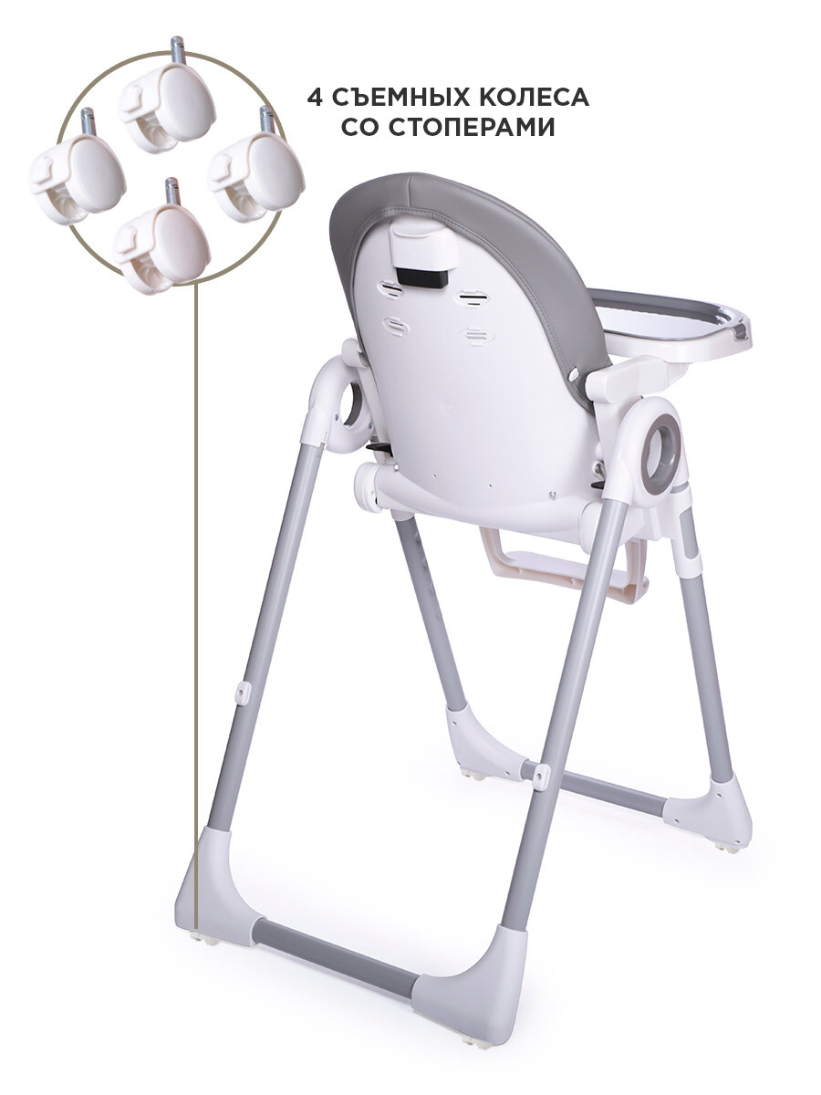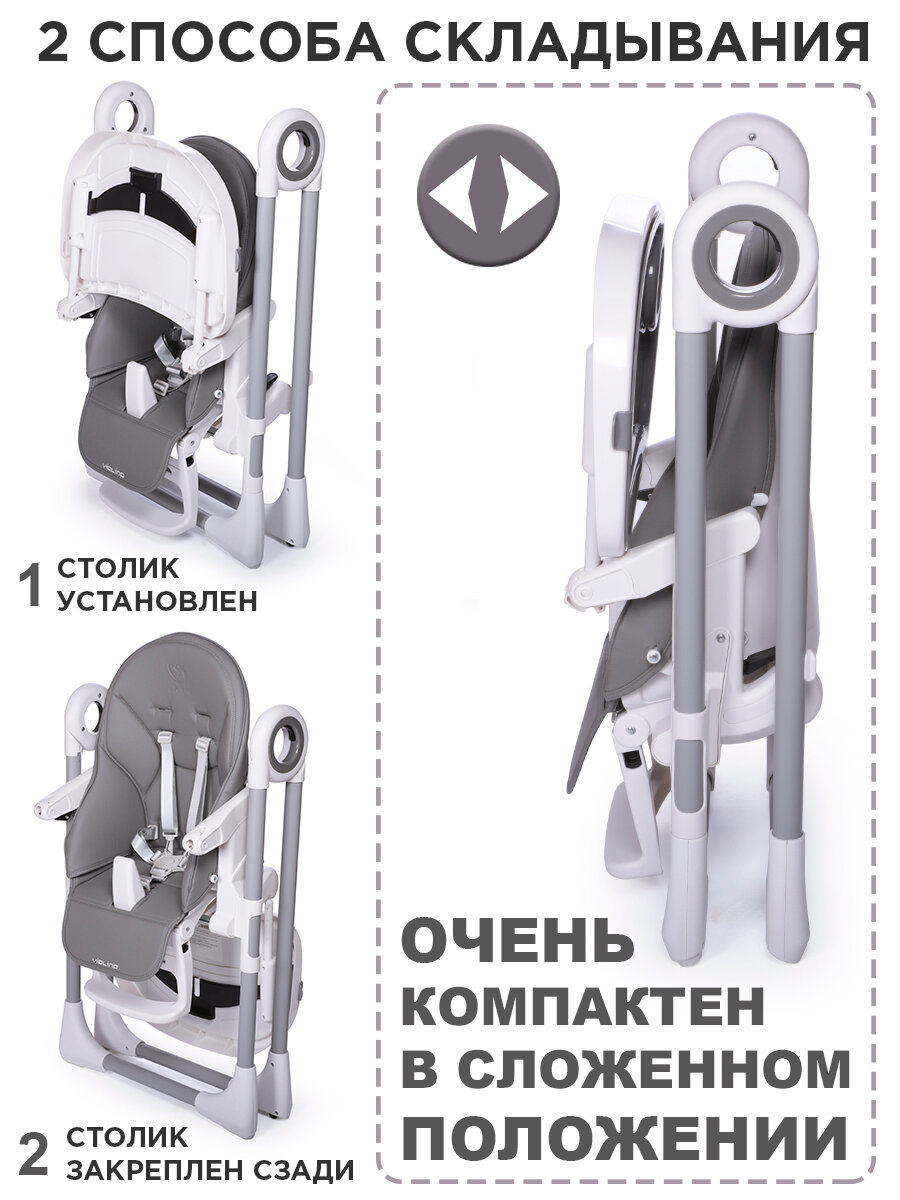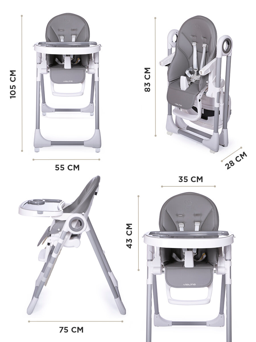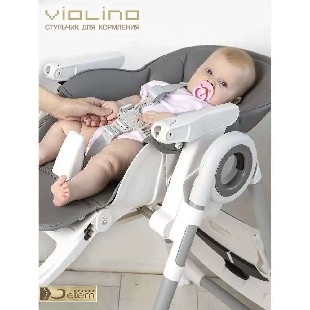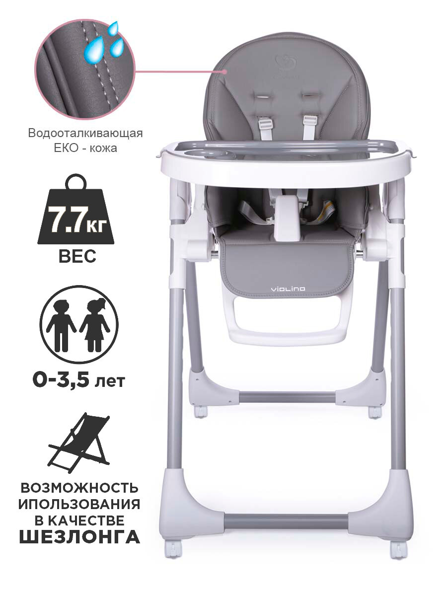 Начали прикармливать сына с 5 месяцев, тогда он еще не сидел. Поэтому нужен был стульчик с откидывающейся спинкой. Остановили выбор на Jetem Violino. У нас он темно-серый, очень приятный на вид, за экокожей легко ухаживать, чистится салфеткой, поднос съемный. Стул легкий, двигается легко, но передние ножки без колес, поэтому стоит крепко. В общем в эксплуатации ведет себя отлично, родители и ребенок довольны)