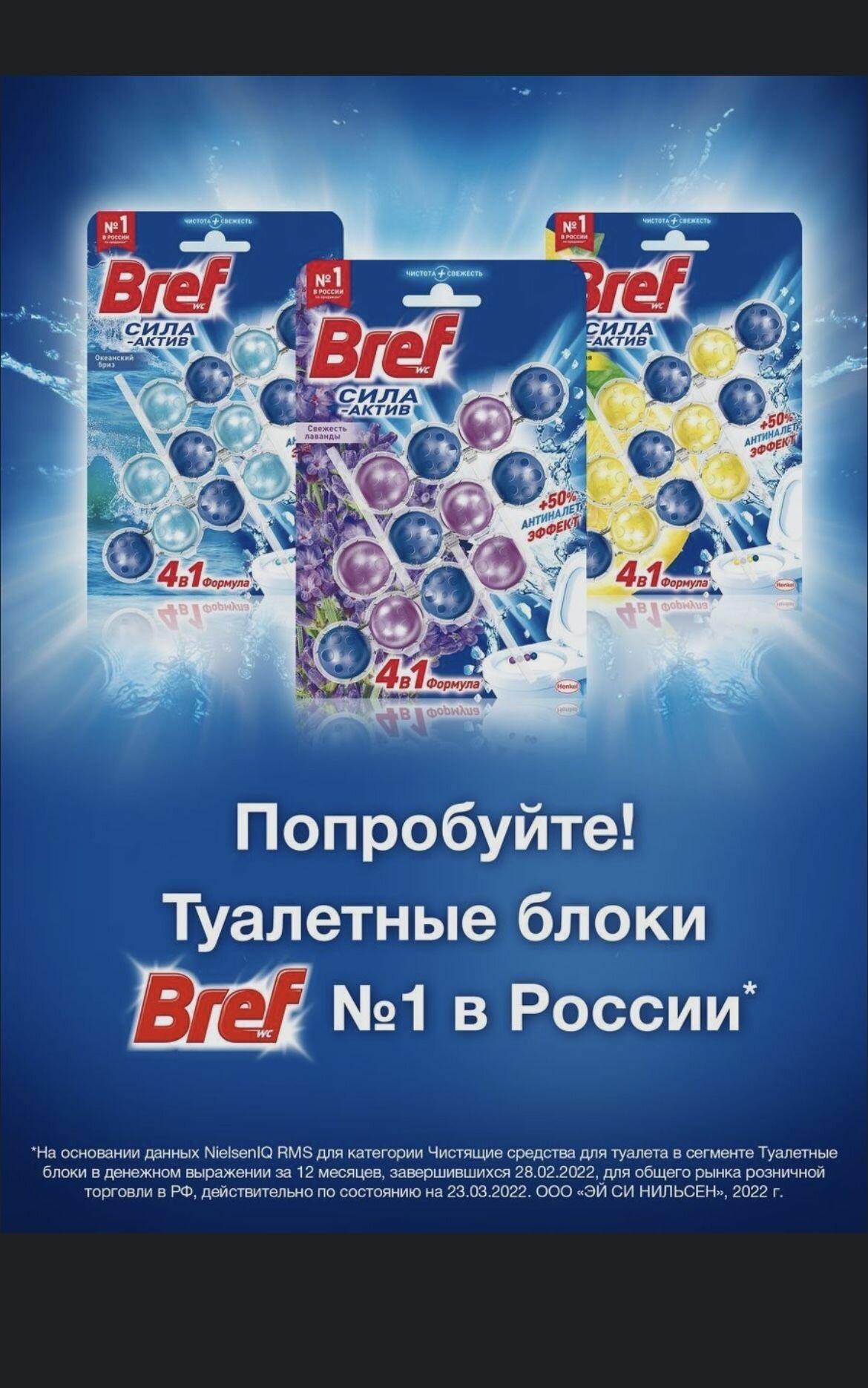 Блок для чистки и свежести унитаза 4 в 1 Bref Сила актив «Свежесть лаванды», 3 x 50 г
