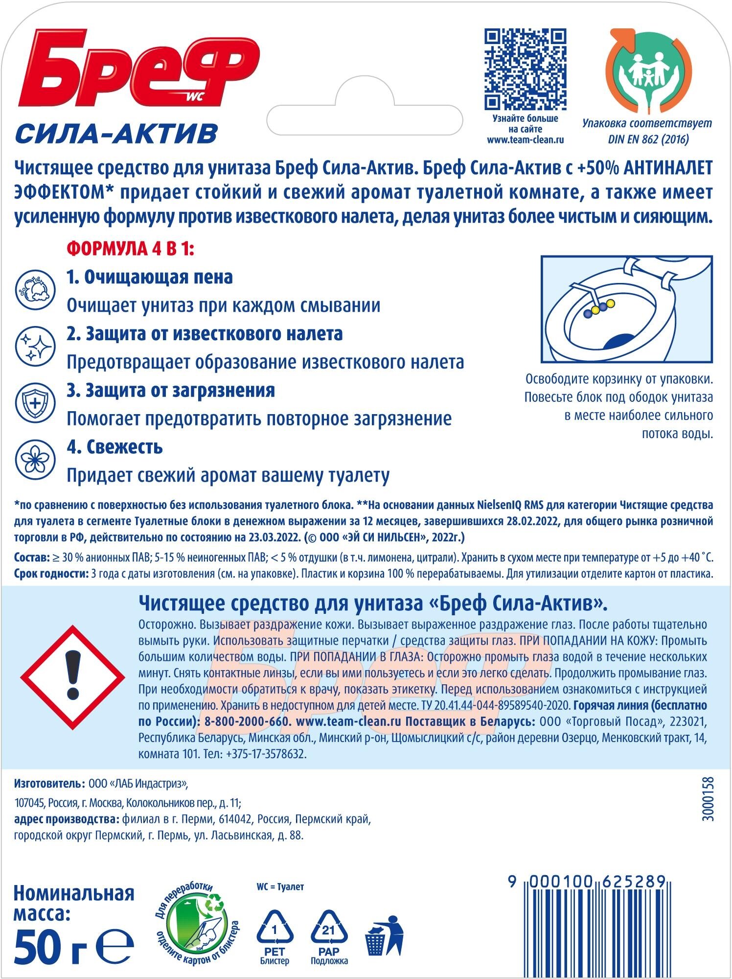 Комплект 15 шт, Подвесной блок для унитаза Бреф "Сила-Актив", лимонная свежесть, 50г, блистер