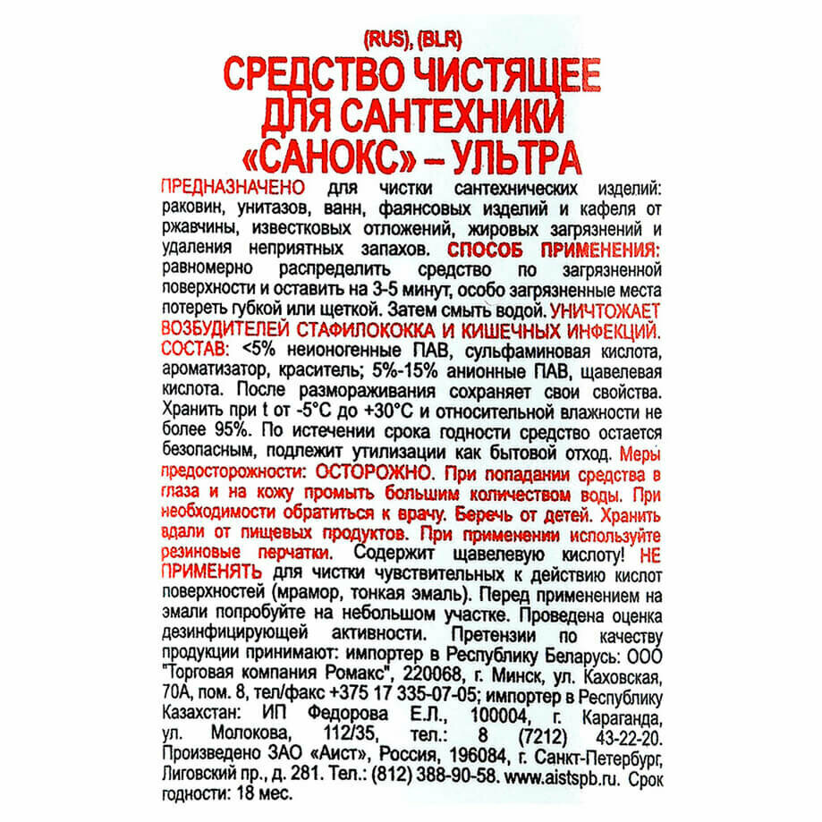 Средство для чистки сантехнических изделий санокс ультра 750мл 4600905000899